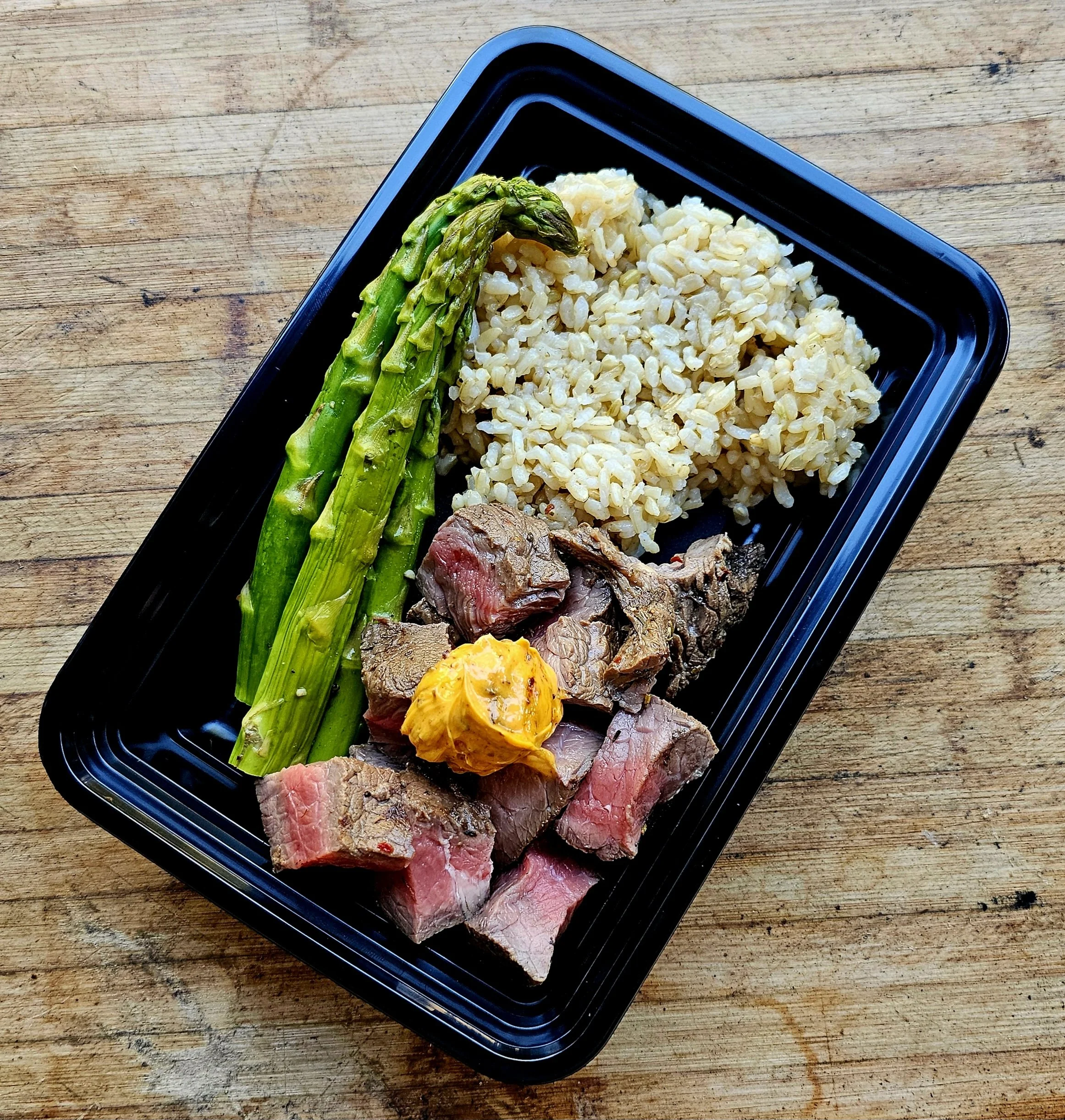 Marinated Grilled Steak, Chili Crisp Compound Butter, Roasted Vegetables, Brown Rice
